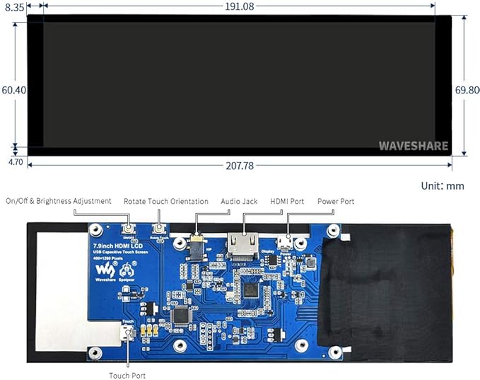 - 7.9inch IPS screen, 400×1280 resolution, HDMI/USB interfaces.